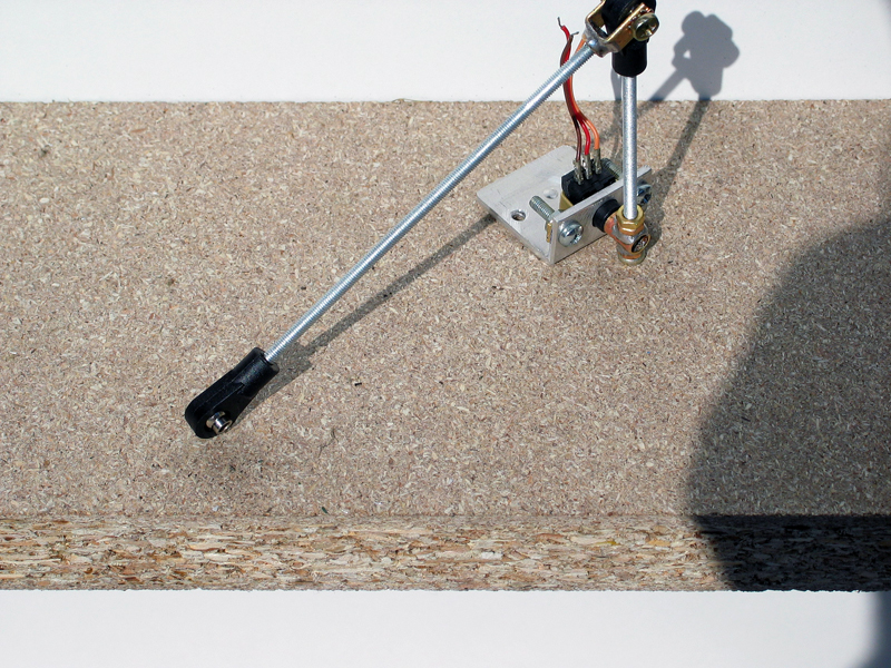 Nach hin und herprobieren habe ich die richtige Länge des Joystickarmes gefunden. Die recht primitive Methode hat sich als sehr zuverlässig in allen bis Heute gemachten Testflügen gezeigt. |